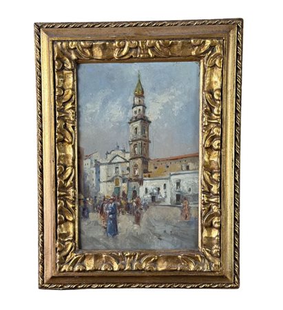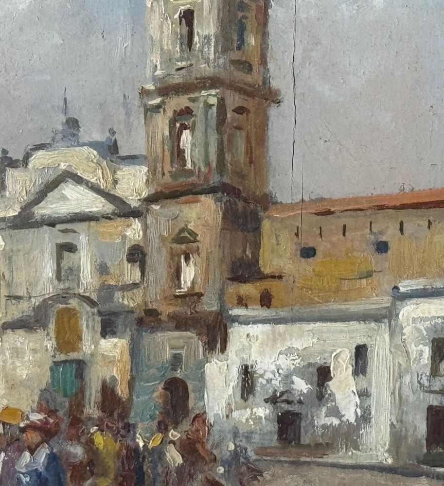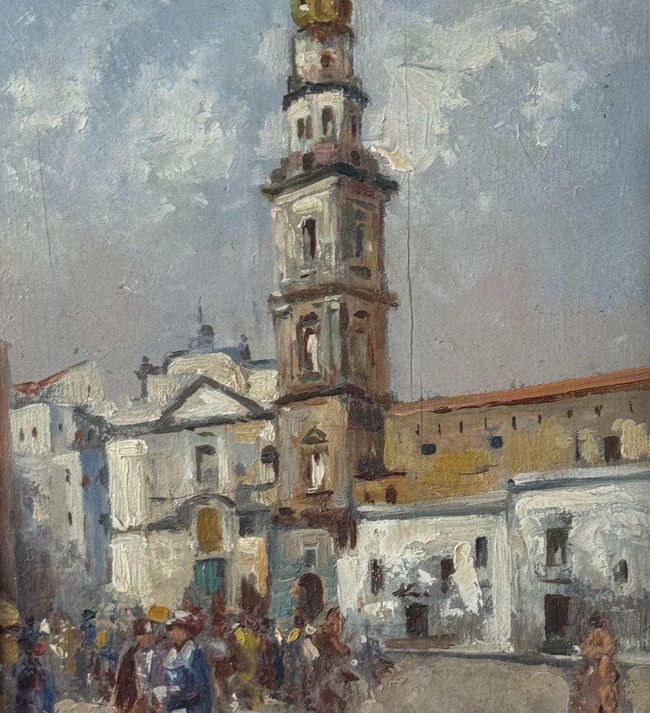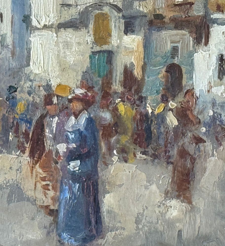 Dipinto olio su tavola, periodo XX secolo scuola Italiana, raffigurante Stradina napoletana con personaggi. Dimensioni compreso cornice: 41x31 cm. Dimensioni interno cornice: 30x20 cm. Reca firma in basso a destra artista non identificato. Opera in buone condizioni.