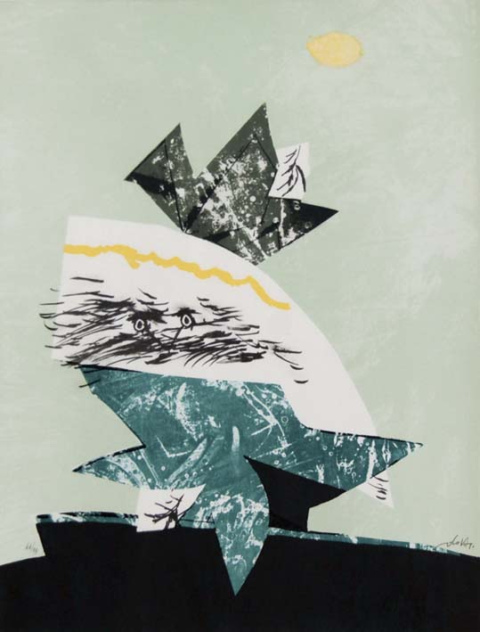 DOVA GIANNI Roma 1925 - Pisa 1991 Gufo verde litografia es. 66/99 70x50 cm firma in basso a destra tiratura in basso a sinistra provenienza Galleria d'Arte Riviera Padova - etichetta e timbro al retro