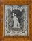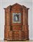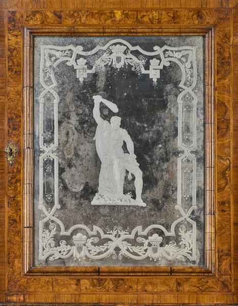 Mobile a due corpi con fianchi mossi di struttura architettonica lastronato e filettato in noce e radica. Parte superiore a quattro colonne a tutto tondo con anta centrale a specchio inciso raffigurante Ercole. Parte inferiore di linea spezzata con tre cassetti sotto calatoia che rivela quattro tiretti. Veneto, secolo XVIII (cm 191x288x70) (difetti e restauri)