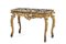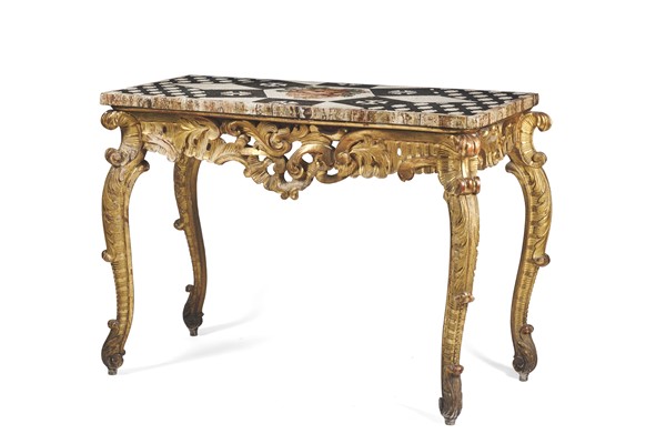 Antico piano con mosaico raffigurante al centro dio Bacco entro medaglione esagonale e motivi geometrici. Bordura in breccia africana. Poggiante su console in legno intagliato, traforato e dorato con decoro a motivi fogliati, gambe a doppia voluta terminanti a ricciolo (cm 132x96x64) (difetti e restauri)