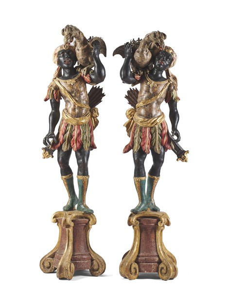 Coppia di mori reggitorcia in legno intagliato, dipinto in policromia e dorato. Raffigurati in abiti da paggi con faretre e draghi ad ali spiegate sulle spalle con bobeche a corona. Basi a colonna a finto porfido terminanti a riccioli. Veneto, secolo XVIII (h. cm 160) (difetti e restauri)
