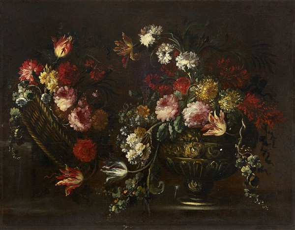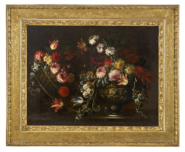 Elisabetta Marchioni "Composizione con cesta e vaso di fiori" olio su tela (cm 7