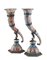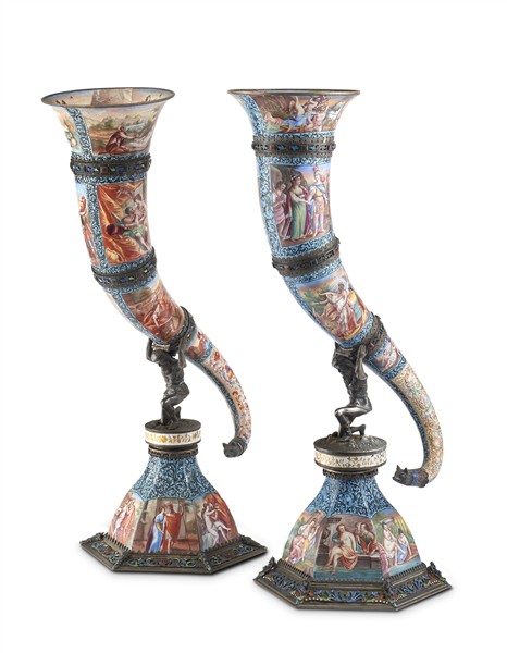 Hermann Böhm (attr), Vienna, circa 1880. Coppia di cornucopie in argento e smalti policromi. Sorrette da uomo barbuto, il corno e la base dipinte in policromia con soggetti biblici e classici, cornici con decori a volute fogliate (h. cm 38) (difetti)