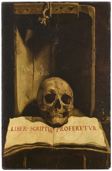 iscrizioni al recto: "BONA BONIS MALA MALIS"; "LIBER SCRIPTVS PROFERETVR"; "TEMPVS BREVE EST"