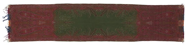 Sciarpa Kashmir, Inghilterra, metà secolo XIX. Tessuta a mano in lana con telaio a tiranti. Riserva color verde invasa da rami fioriti. Alle due testate due motivi cachemire contrapposti allungati nei toni del rosso (cm 288x58) (difetti)