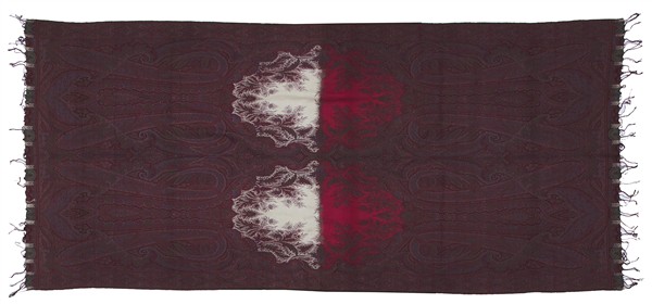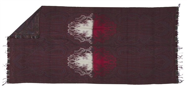 Scialle Kashmir, Inghilterra, secolo XIX. Tessuto a mano in lana e seta con telaio a tiranti. Doppia riserva a fondo metà bianco e metà rosso per dare la possibilità di essere indossato in varie fogge. Il decoro è formato da motivi cachemire policromi con base rosso scuro uniti a volute per formare un decoro a tutto campo (cm 360x153) (difetti)