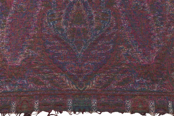 Scialle Kashmir, Inghilterra, secolo XIX. Tessuto a mano in lana e seta con tel