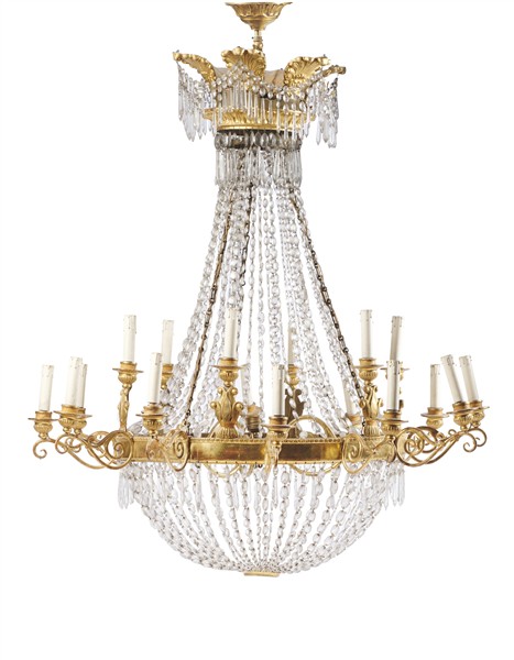 Lampadario a mongolfiera in metallo, legno e stucco dorato a diciannove luci con pendenti e festoni di raccordo in vetro sfaccettato. Secolo XIX (h. cm 118 ca.) (difetti e rotture)