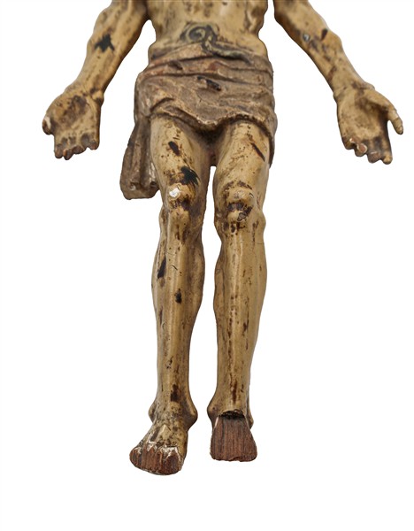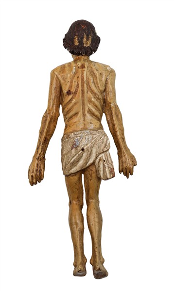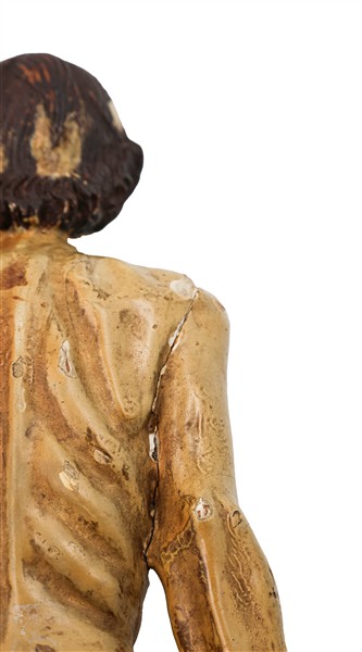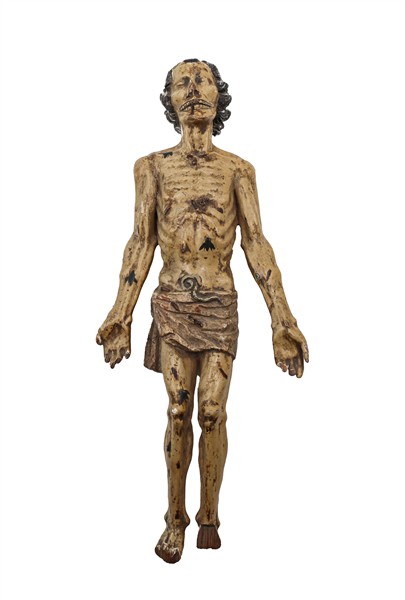 Arte tedesca, fine secolo XVI. "Vanitas" scultura in legno dipinto raffigurante figura maschile (h. cm 34,5) (difetti e mancanze)