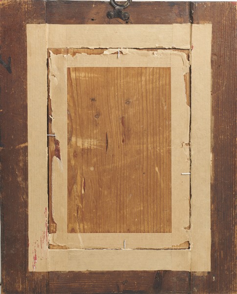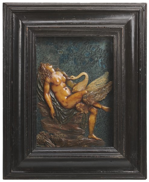 Ceroplasta del secolo XVIII. Composizione in cera policroma raffigurante Leda e il cigno. Cornice in legno ebanizzato a cassetta con vetro (cm tot 36x29) (difetti e restauri)