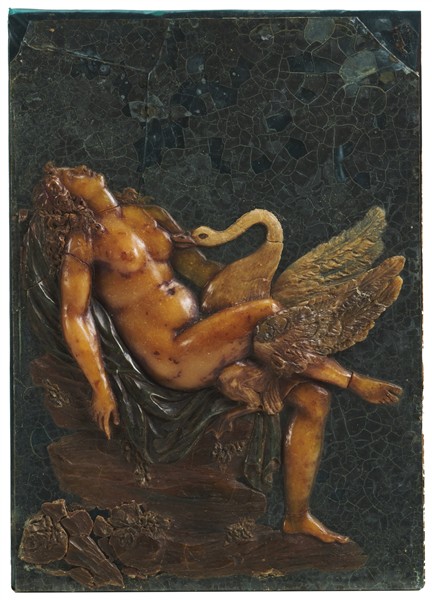 Ceroplasty of the 18th century. A polychrome wax composition depicting Leda and the swan. Framed (cm tot 36x29) (defects and restorations)