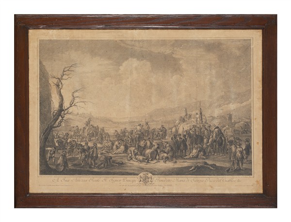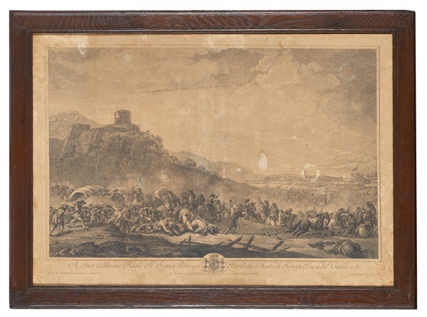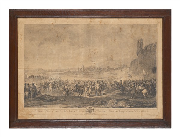 F. Simonini (1686-1753), T. Viero (1740-1819). Gruppo di quattro incisioni del secolo XVIII raffiguranti battaglie dedicate a Sua altezza Reale il Signor Principe Benedetto Maria di Savoia Duca del Cablese ecc (cm 58x83) in cornici (difetti) Incisioni simili sono conservate nella collezione del Castello di Racconigi