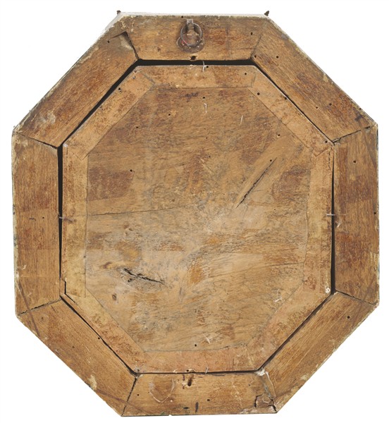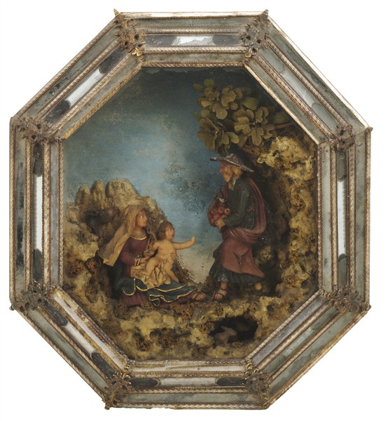 Ceroplasta veneto del secolo XVIII. Composizione in cera policroma e altri materiali raffigurante il Riposo durante la fuga in Egitto. Cornice di forma ottagonale in legno dipinto a finto marmo con bordure decorate a canne di vetro ritorto su fondo specchiato a triplo ordine e applicazioni di fregi in metallo dorato (cm tot 31x28) (difetti e piccole mancanze)