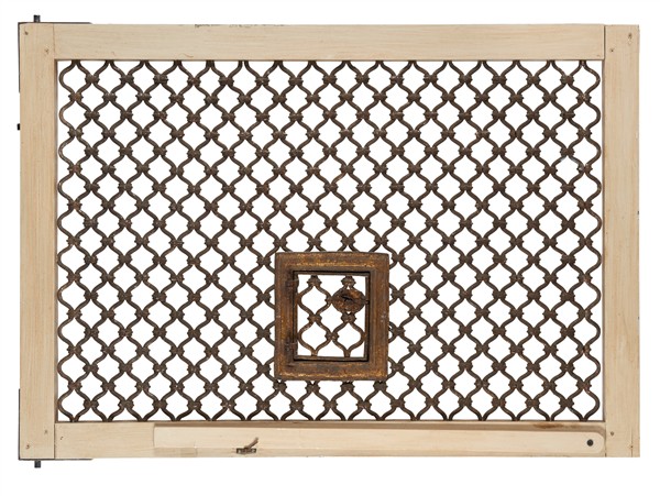 Iron and gilded parlor grate. Southern Italy, 17th-18th century. Large rectangular panel with lock. Mounted on modern wooden structure (cm 159x111) (defects)