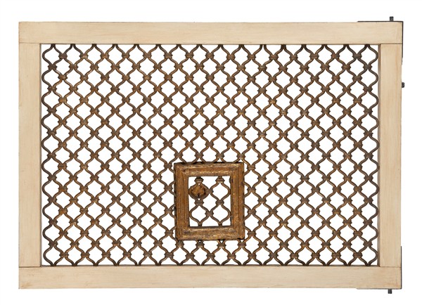 Grata da parlatorio in ferro forgiato e dorato. Italia meridionale, secolo XVII-XVIII. Grande pannello rettangolare con disegno a losanghe riunite da fascette modanate. Piccolo sportello centrale di forma quadrata con cornice sagomata ed apertura a cerniera laterale, con serratura. Montato su struttura lignea moderna (cm 159x111) (difetti)