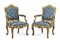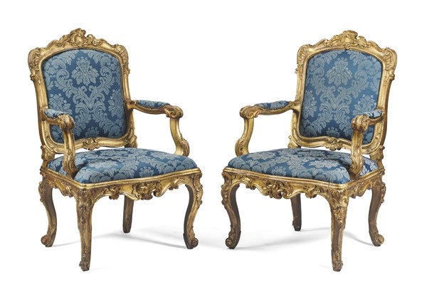Coppia di poltrone in legno intagliato e dorato. Decoro rocailles con foglie e fiori, cartigli tra volute e piedi a ricciolo. secolo XVIII. Seduta e schienale rivestiti in tessuto operato blu (difetti) en suite con il lotto 405