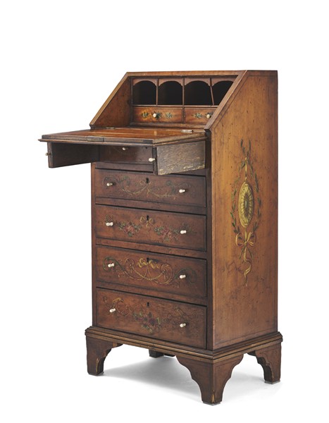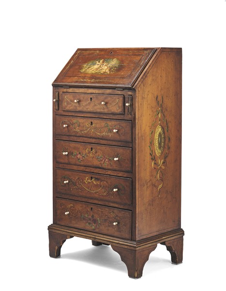 Scrittoio da bambino in satinwood parzialmente dipinto in policromia con calatoia che rivela due tiretti e quattro vani a giorno, cinque cassetti sul fronte con prese in avorio, piedi a mensola. Inghilterra, inizio secolo XIX (cm 38x74x25) (difetti)