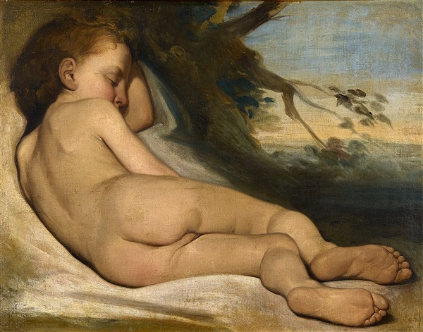 Scuola francese della prima metà del secolo XIX "Putto dormiente" olio su tel