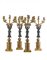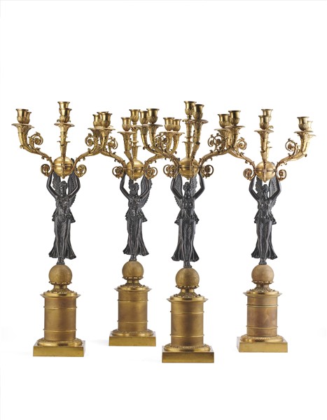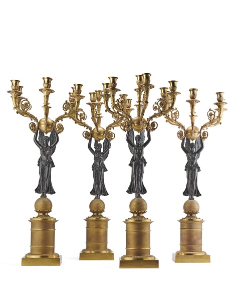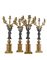 Gruppo di quattro candelabri a sei fiamme in stile Impero in metallo dorato e b