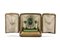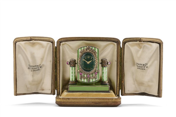 Pendoletta in argento dorato e smalti. Cassa basculante decorata da cornice a corolla con festoni e cabochons di rubini sintetici, montata su due colonne. Quadrante in smalto verde guillochè a numeri arabi rimarchiato "Tiffany made in Swiss". Fondello in avorio. Alla base marchi inglesi di importazione "DP", 1909. Entro custodia in cuoio impresso in oro marcata all'interno Tiffany & Co. 221 Regent St. W. London. Inizio secolo XX (h. cm 5) (difetti e mancanze)
