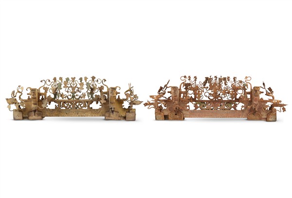 Sicilian art, 20th century. Two different friezes of carved wood cart with iron. Added respectively "FRATELLI FLORIDIA COMISO" and "MESSINA VINCENZO PALAZZOLO" (cm 119x32) (defects)