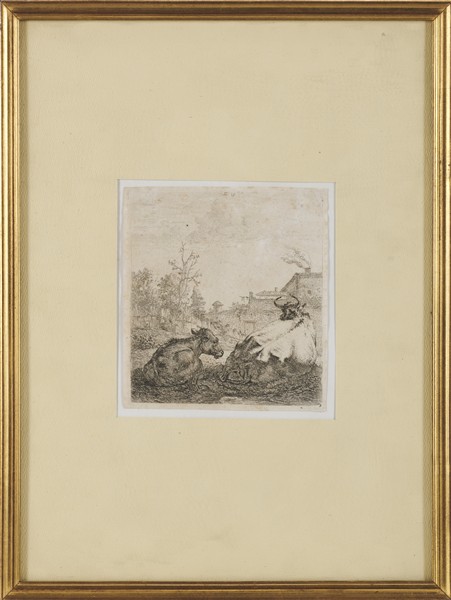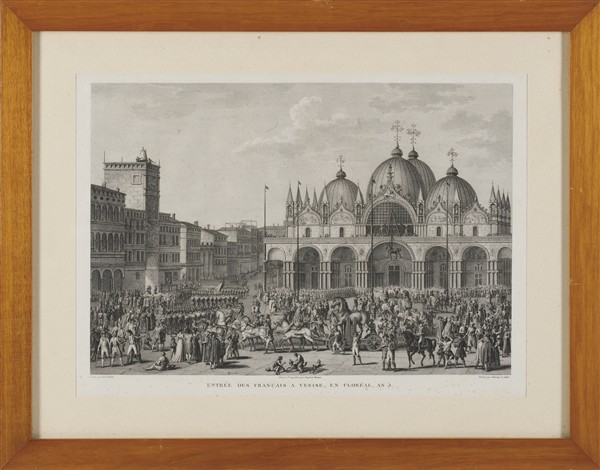 Lotto composto da un'acquaforte di J. Duplessis-Bertaux intitolata "Entrata dell'esercito francese a Venezia" e raffigurante ratto equestre, un'incisione di C. Lalaisse tratta dall'"Histoire de la République de Venise" di L. Galibert, una litografia colorata da un acquerello di N. de Rothschild e un'acquaforte di Karel Du Jardin dal titolo "Riposo" (c. 1652), di misure differenti