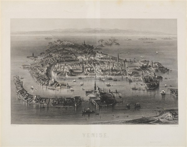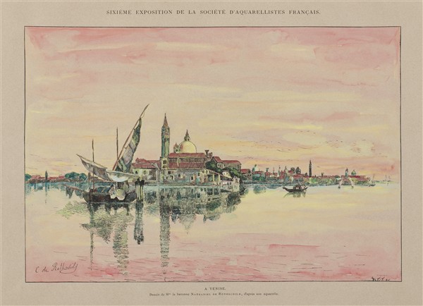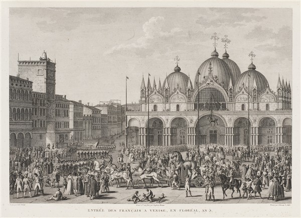 Lot consisting of an etching by J. Duplessis-Bertaux depicting the entry of the French Army into Venice, an engraving by C. Lalaisse from the work "Histoire de la République de Venise" by L. Galibert, a colored lithography from a watercolor by N. de Rothschild, and an etching by Karel Du Jardin titled "Rest" (c. 1652).