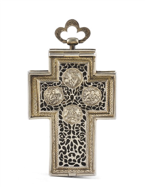 Orologio pendente a forma di croce in argento inciso e traforato. Movimento sol