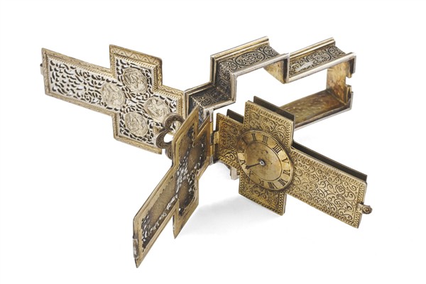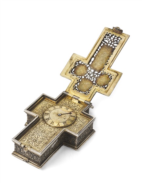 Cross-shaped pendant watch in silver engraved. 17th-18th century (h. cm 9) (defects)