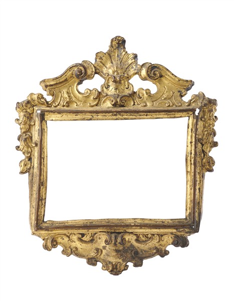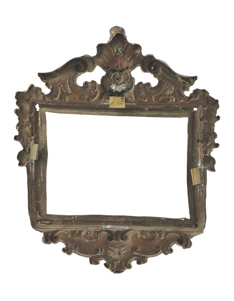 Cornice in rame sbalzato e dorato di forma rettangolare con cimasa e fregio a volute contrapposte e motivi rocaille. Secolo XVIII (cm 25x21, luce cm 10,5x14,5) (difetti)