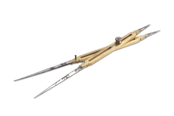 Compasso di riduzione in ottone e acciaio entro custodia. Secolo XIX (h. cm 34) (difetti)