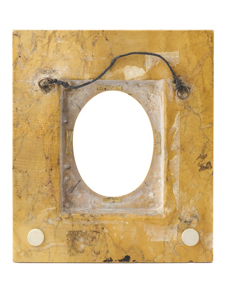 A 17th-18th century yellow marble frame of rectangular shape with relief decorated by black marble inserts and light oval (cm 17,5x15,5, light cm 8x6) (defects)
