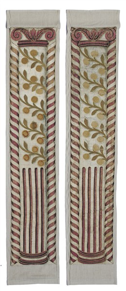 Manifattura del secolo XVII. Coppia di pannelli decorativi da parete confezionati con strisce di stoffa colorata e dipinta in raso di seta a doppio corpo. Decoro raffigurante colonne con capitello ed un ramo fiorito che avvolge la parte superiore della colonna (cm 277x55) (difetti e restauri)