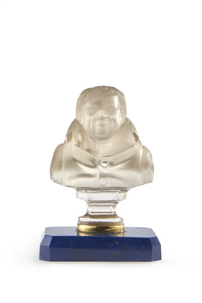 Artista della prima metà del secolo XIX. Mezzobusto raffigurante gentiluomo con pellicciotto in cristallo con ghiera in oro 18k, su base sagomata in lapislazzuli (h. cm 10) (difetti)