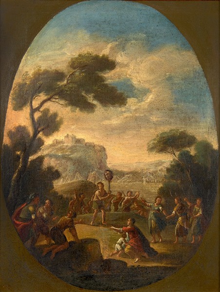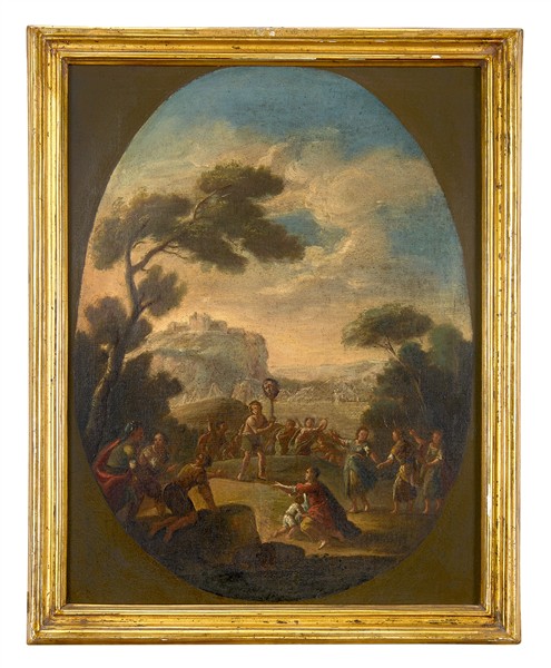 Scuola del secolo XVIII Coppia di dipinti raffiguranti "Davide e Golia" e "Mos