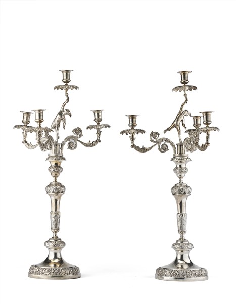 Coppia di candelieri a quattro fiamme in argento. Porta candela centrale sorret
