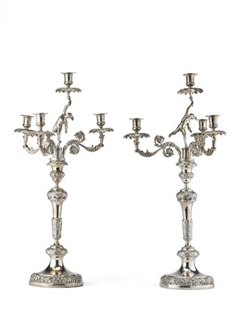 Coppia di candelieri a quattro fiamme in argento. Porta candela centrale sorretto da figura di mercurio e laterali da ramage con volute e fiori. Fusto a colonna cesellata a motivi fogliacei e rose. Parti non pertinenti. Marcati nelle basi Conti e Livi (g lordi 3690) (h. cm 66) (lievi difetti)
