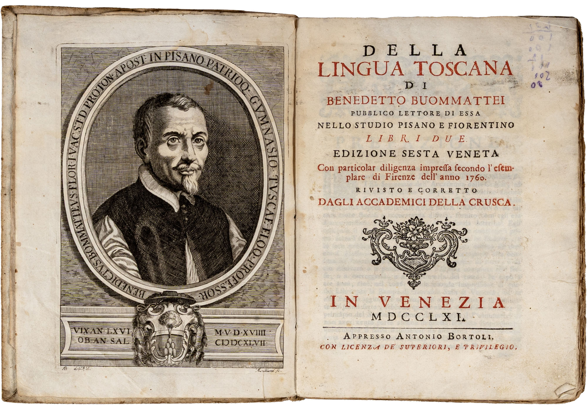 BUOMMATTEI BENEDETTO - DELLA LINGUA TOSCANA - RIVISTO E CORRETTO DAGLI ACCADEMICI DELLA CRUSCAVenezia, BORTOLI 1761Pp. XVI + 356 legatura coeva, autore manoscritto al dorso, front. in rosso e nero, fregi, capilettere - bel ritratto in antiporta (Zuliani)In 8°Foro di tarlo dalla pagina 197 alla fine del volumeCondizioni generali discrete