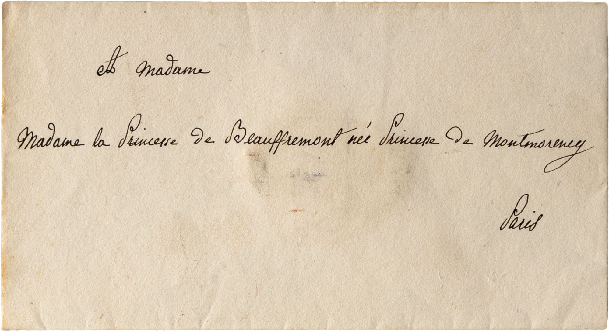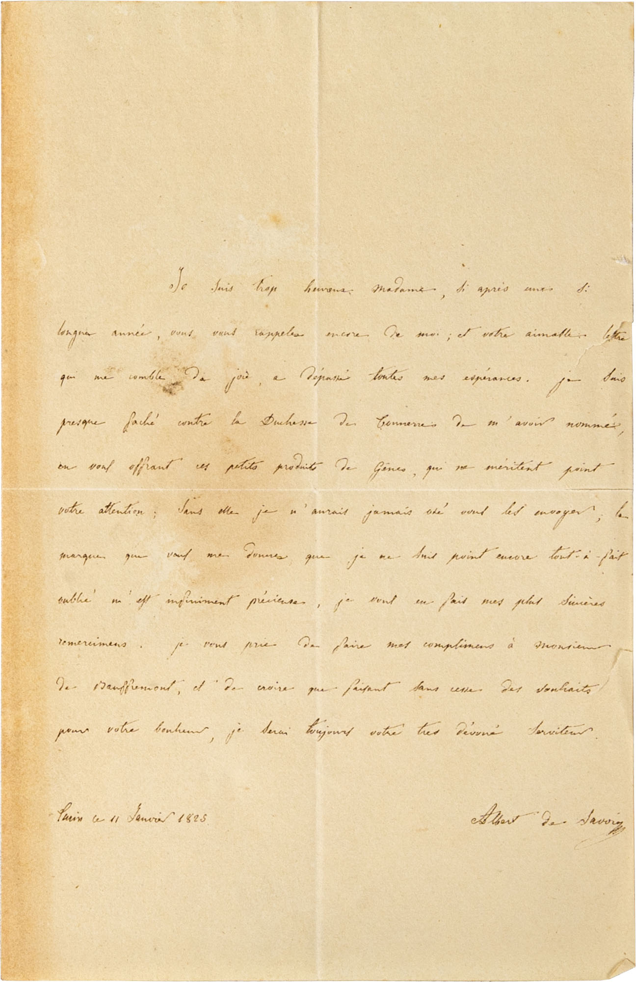 CARLO ALBERTO DI SAVOIA - Lettera indirizzata alla principessa di BeauffremontTorino, 11 gennaio 182519,8 x 12,8 cm.Con la tipica calligrafia minutissima e quasi illeggibile a occhio nudo. La missiva è autografa ed è firmata dal principe 'Albert de Savoie' con luogo e data, Turin 11 janvier 1825. è presente anche la busta di spedizione (probabilmente a mano) con il sigillo principescoCarlo Alberto è stato Re di Sardegna dal 27 aprile 1831 al 23 marzo 1849, e sovrano degli stati sabaudi