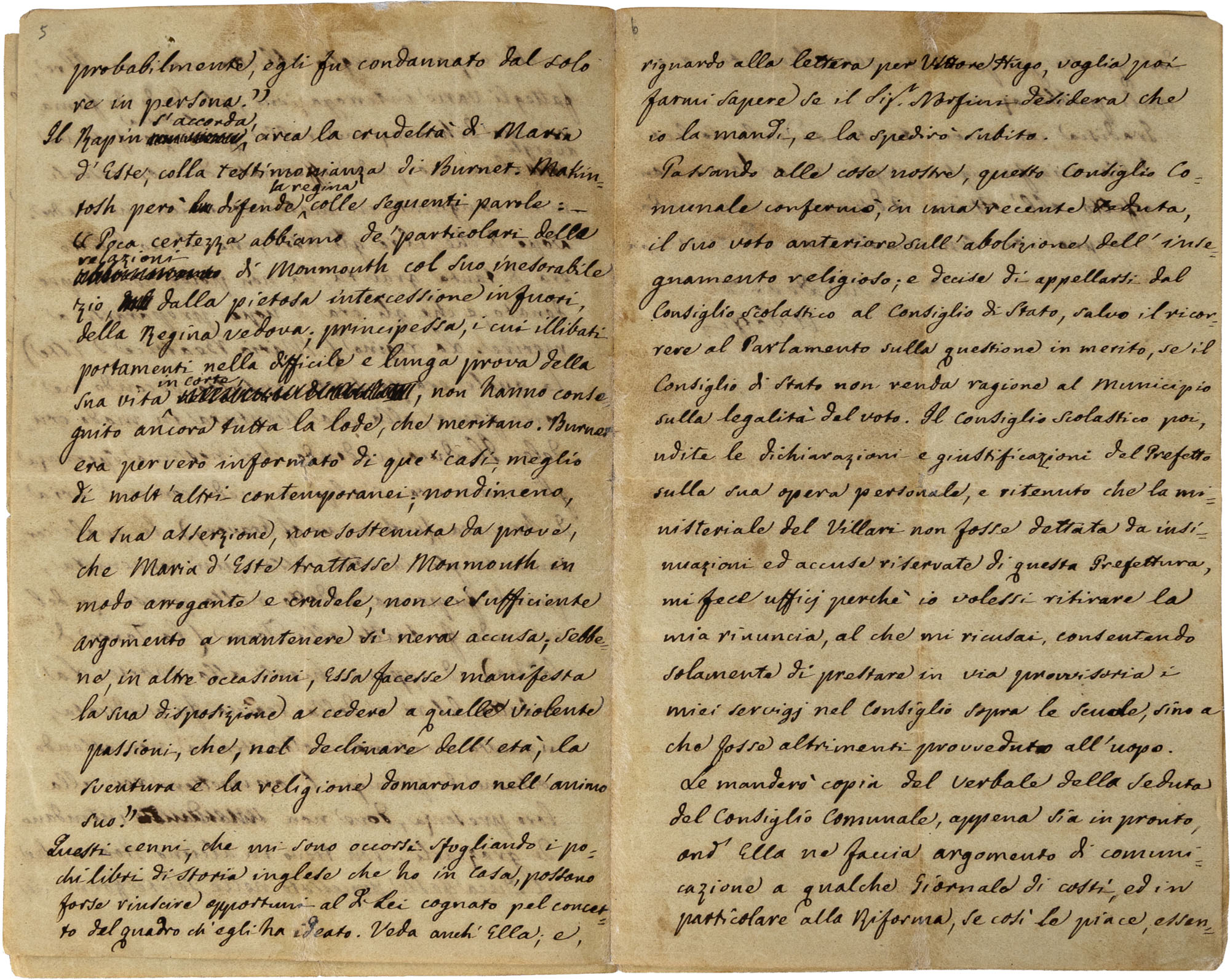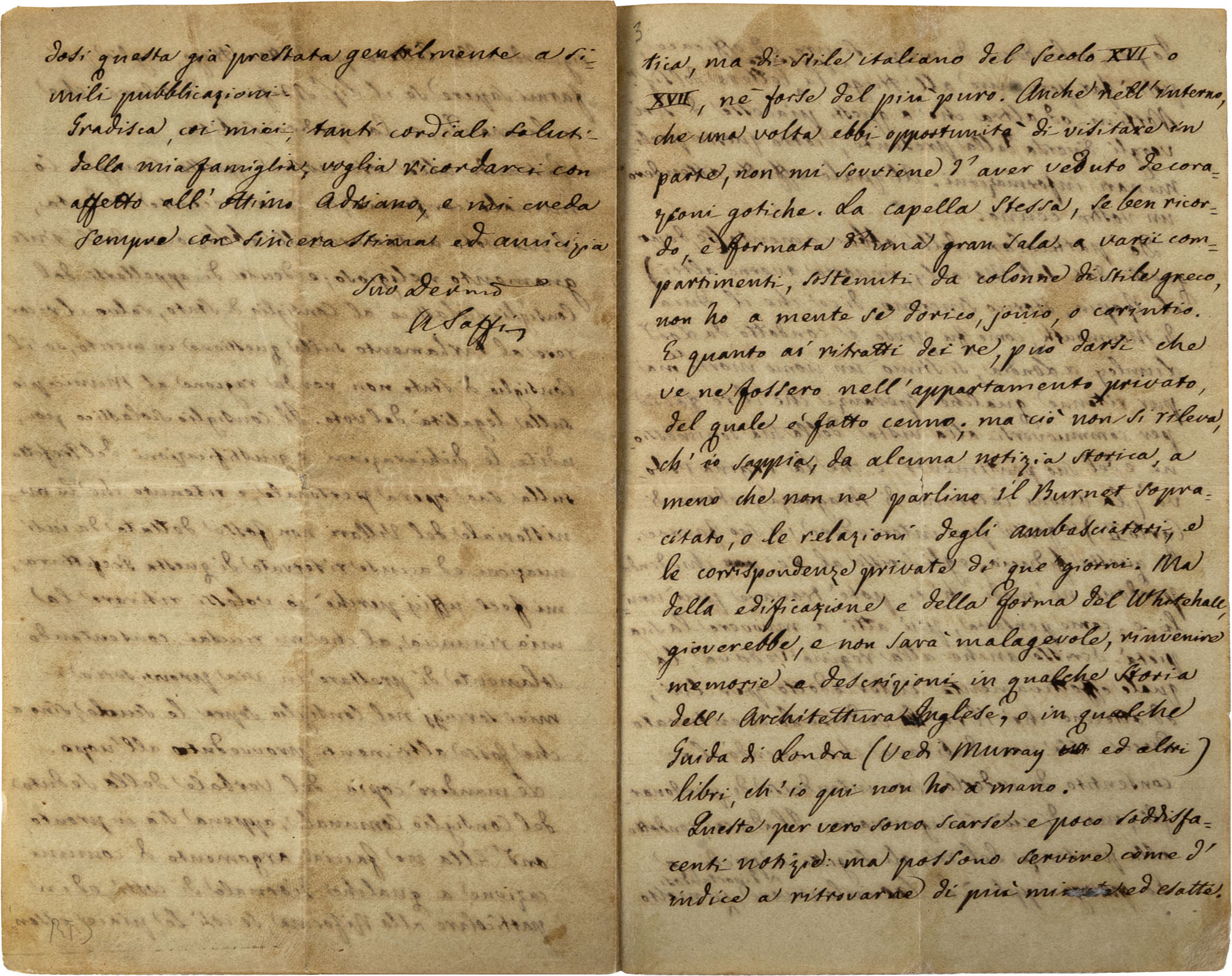 Nella lettera il Saffi in qualità di Storico dà alcune notizie da lui reperite in merito all'incontro tra Giacomo II e il Duca di Monmouth. In seguito alla cattura quest'ultimo, domandò la grazia mai ottenuta dal re senza nemmeno un processo. Giacomo infatti voleva mettere a tacere le voci e lo scandalo in merito al rapporto del Duca con la Regina vedova. Congetture fatte a partire dalla comparazione di diversi scritti d'epoca. Inoltre parla del palazzo di Whitehall a Londra, descrivendone caratteristiche stilistiche
