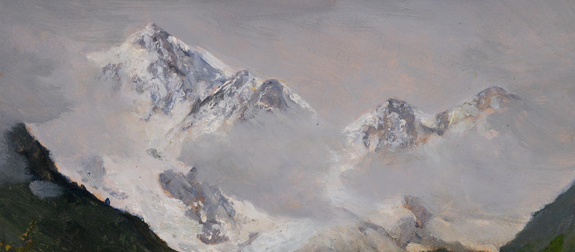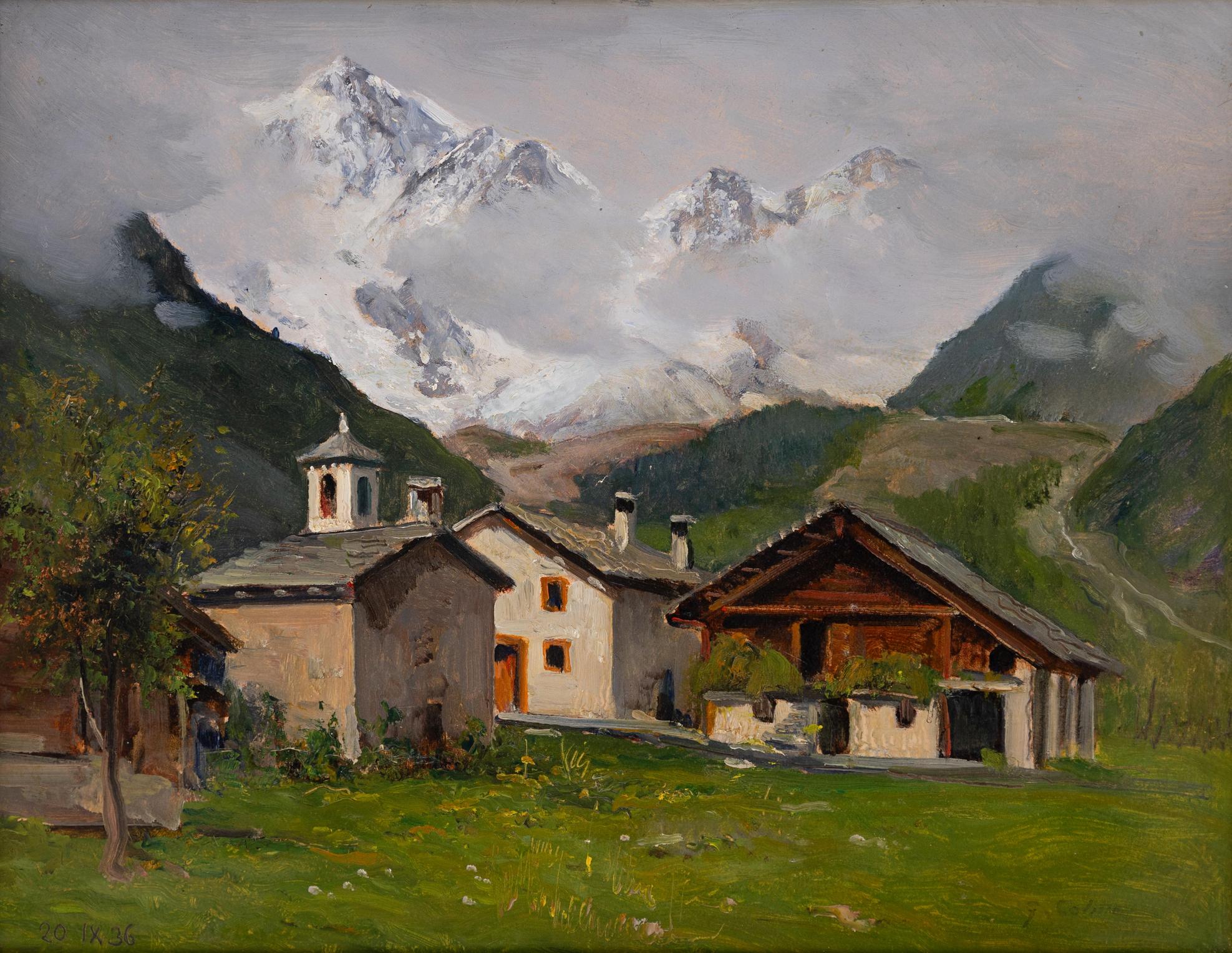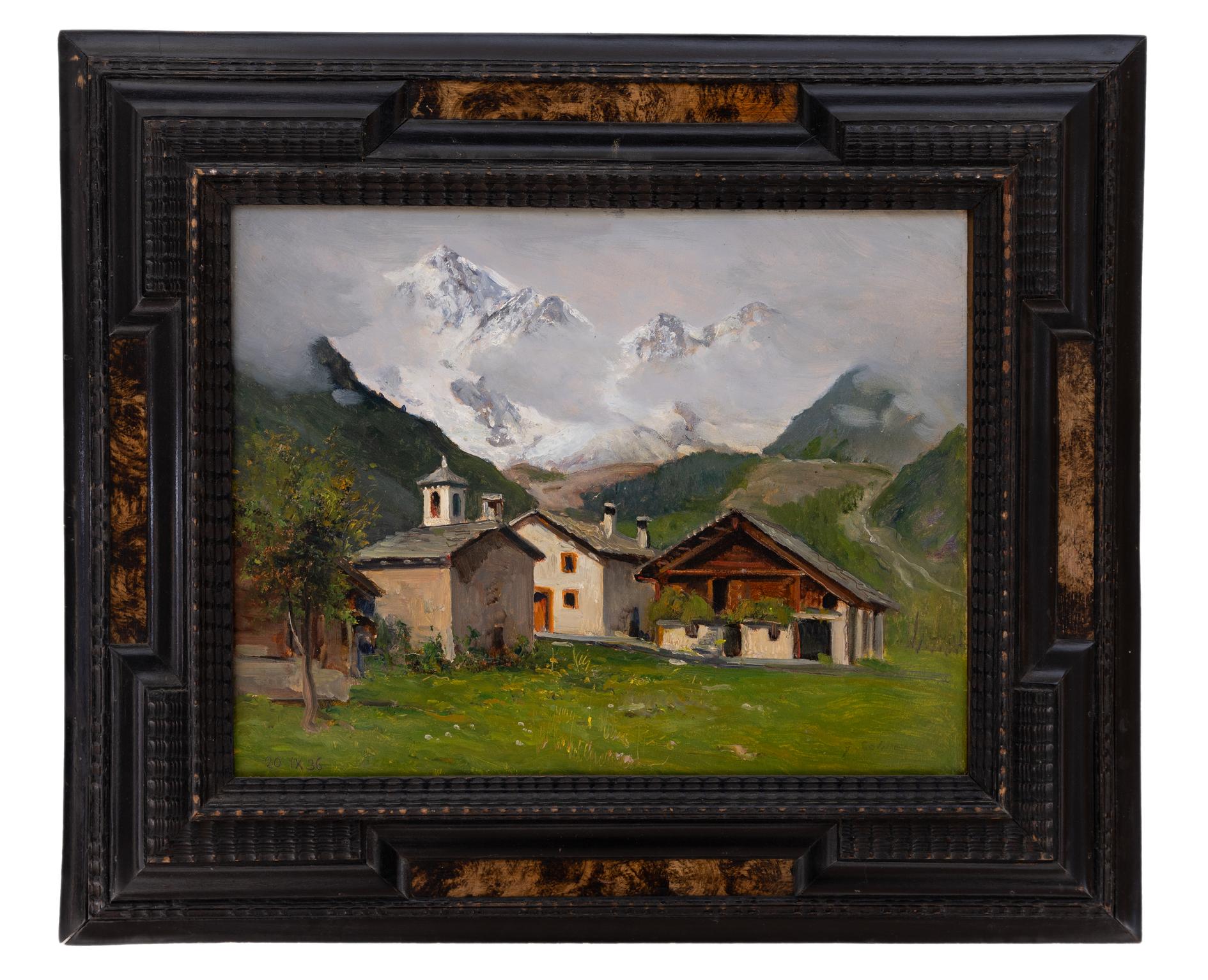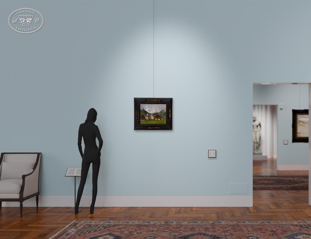 Giovanni Colmo - Alle falde del Rosa - Torino 1867-1947 - Olio su cartone cm 34x44 - Giovanni Colmo è stato un pittore italiano del XIX e XX secolo, noto per la sua dedizione al paesaggio e per la sua formazione autodidatta. Nato a Torino il 13 maggio 1867, era il fratello maggiore di Eugenio Colmo, noto caricaturista con lo pseudonimo di «Golia». Dopo aver frequentato il Liceo Classico, si iscrisse alla Scuola di Applicazione per Ingegneri, laureandosi in Ingegneria Civile nel 1891. Per alcuni anni lavorò presso il Comune di Torino, ma nel 1923, all’età di cinquantasette anni, decise di dedicarsi esclusivamente alla pittura.La sua pittura, legata ai canoni paesaggistici piemontesi del XIX secolo, pur indebolita da una certa convenzionalità, toccò momenti di buon valore nella produzione di tavolette di minori dimensioni. Colmo fu assiduo espositore al Circolo degli artisti di Torino e partecipò ad alcune edizioni della Quadriennale di Torino. Oltre che nel suo amato Piemonte, dipinse a Venezia, Chioggia, Roma e in Umbria, soffermandosi sui laghi lombardi e sulla riviera ligure.Dopo la Seconda Guerra Mondiale, visse ed operò tra Garessio e Finale Ligure. È sepolto nel Cimitero monumentale di Torino.La Pinacoteca Civica di Garessio ha dedicato a Giovanni Colmo ed al fratello Eugenio due sale permanenti, conservando alcune delle sue opere più significative.