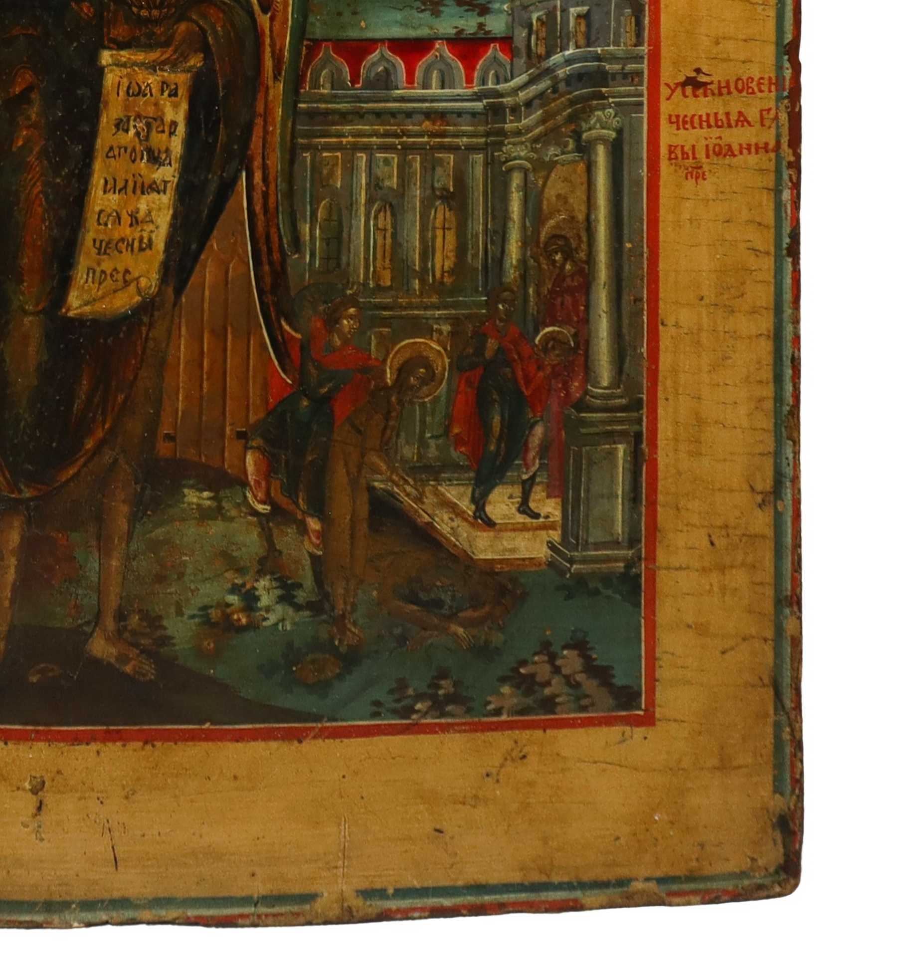 Icona russa raffigurante San Giovanni con sacri episodi, Fine 18° secolo h cm 36X31,5 spessore cm 2,5 tempera all'uovo e oro zecchino su tavola