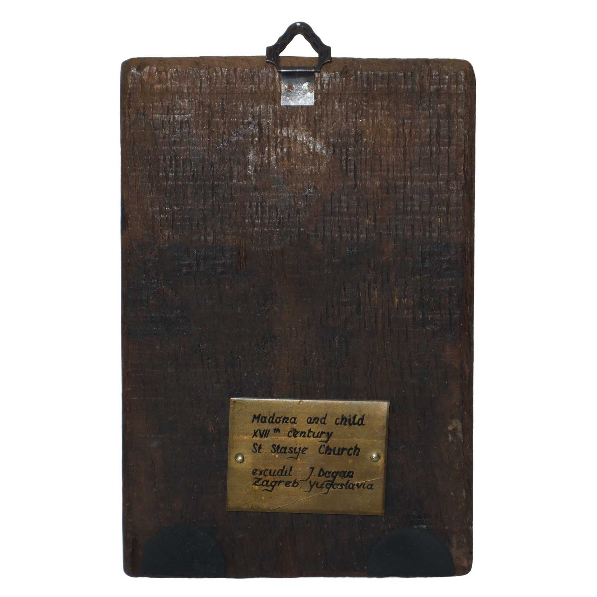 Icona Jugoslava raffigurante Madonna con Bambino, 17° secolo h cm 16,5X11 tempera su tavola Placca in ferro sul retro