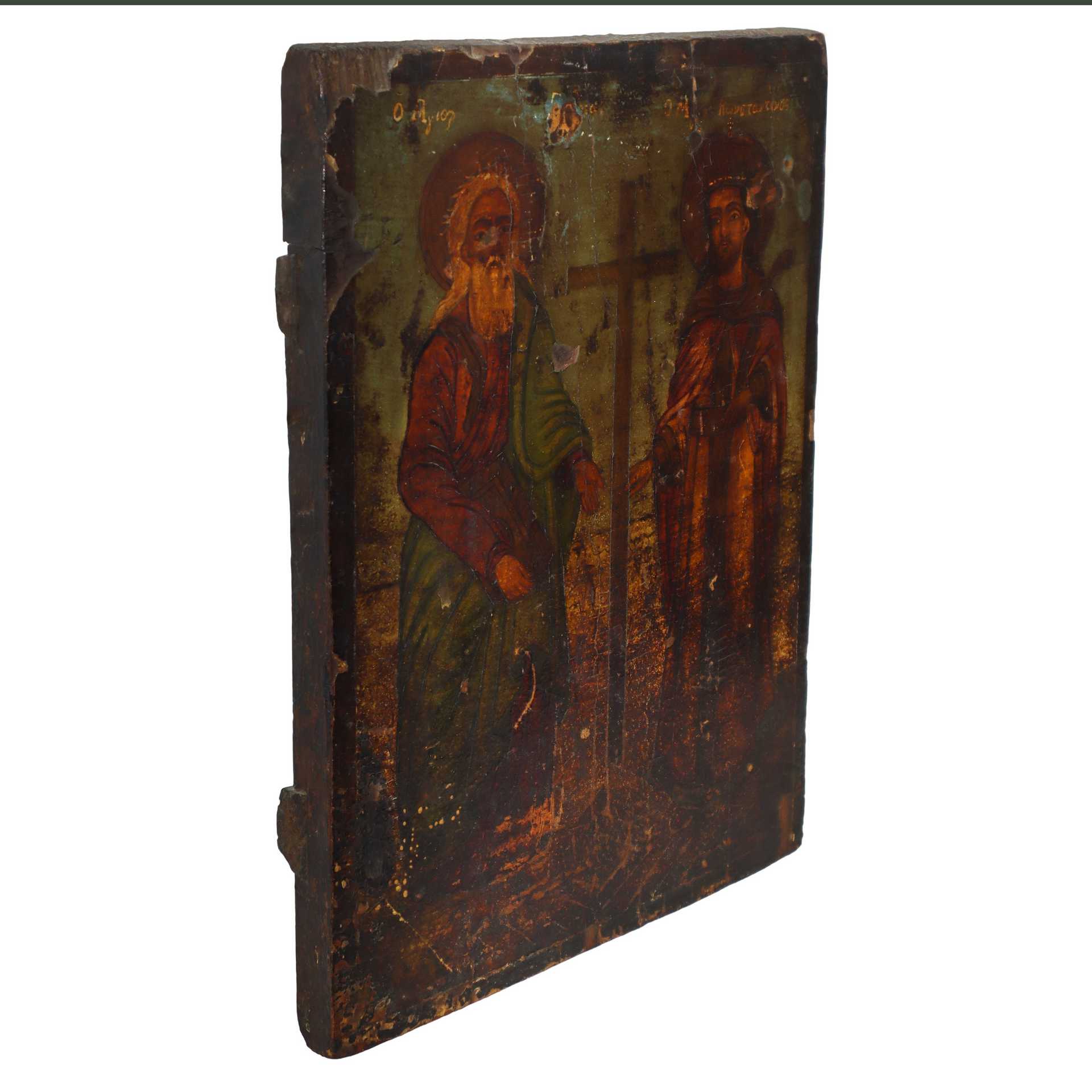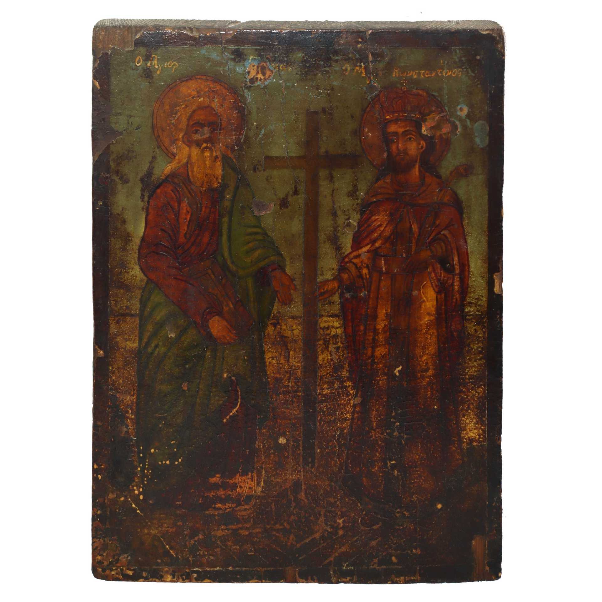 Icona bizantina con Cirillo e Costantino in legno di abete dipinta a tempera e olio, Fine 18° secolo