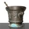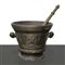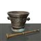 Mortaio in bronzo con Pestello, 19° secolo H cm 20, bocca cm 24 Prese con decorazioni di teste d'uomoPrese con decorazioni di teste d'uomo
