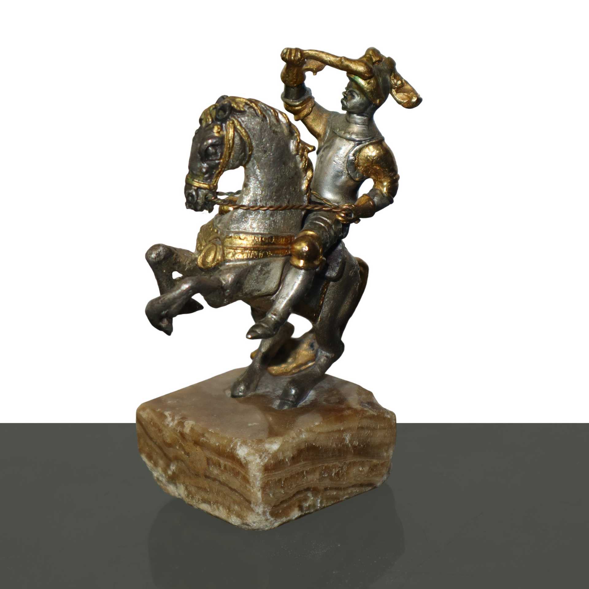 Piero Benzoni (1938) - N°3 piccole statue di cavaliere a cavallo in bronzo argentato e dorato montate su base in onice
