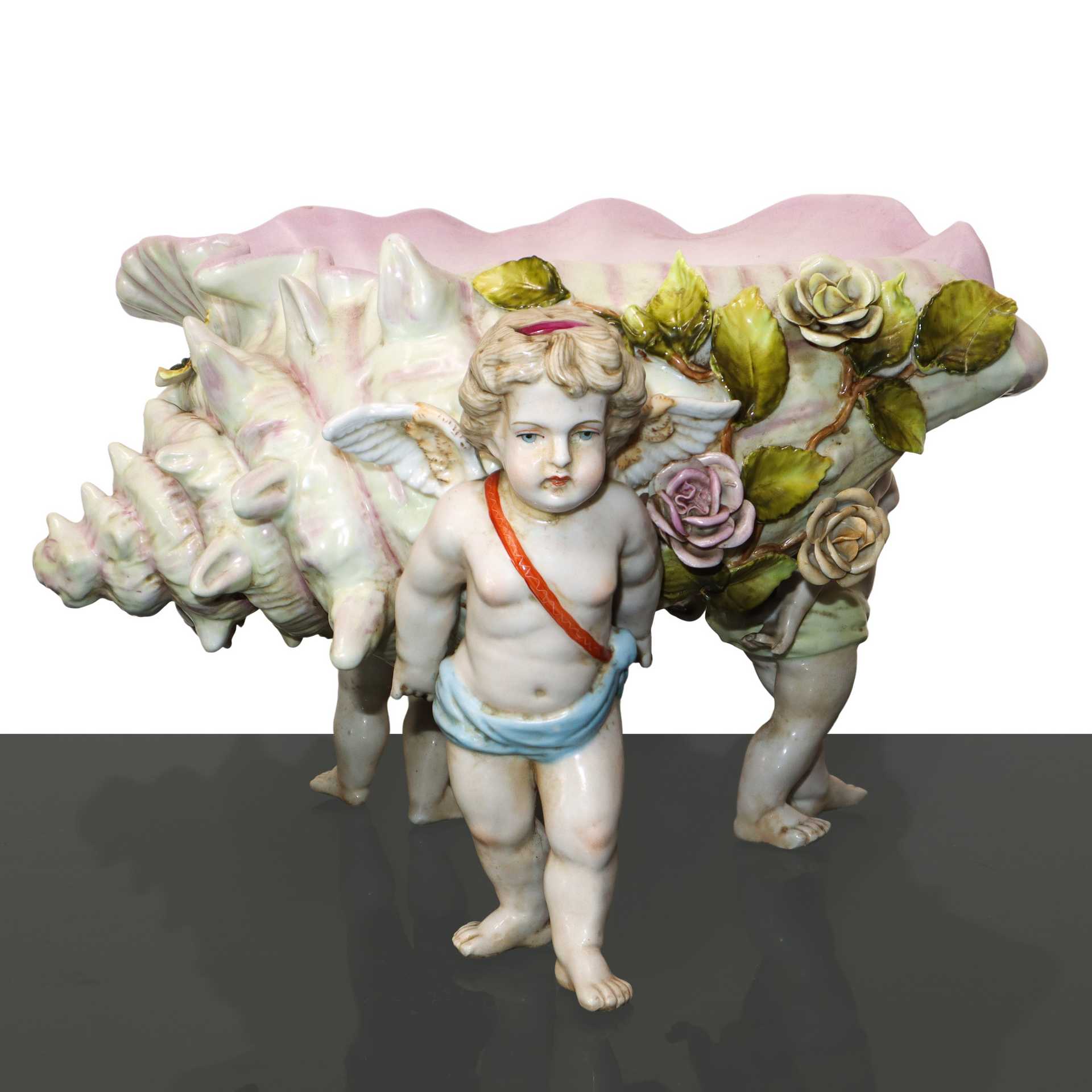 Porcelain Meissen - Centrotavola a conchiglia retto da tre putti alati in porcellana policroma, 20° secolo