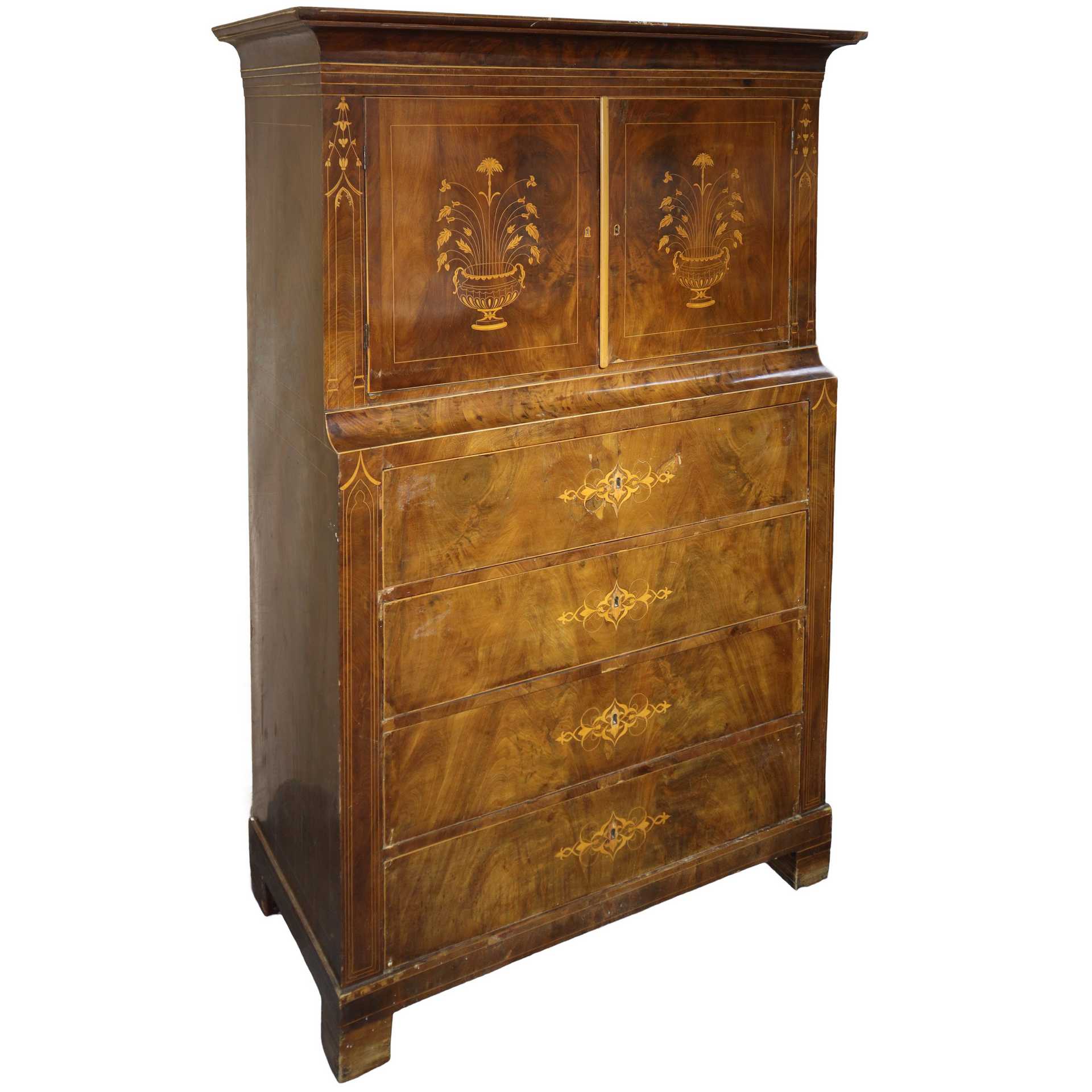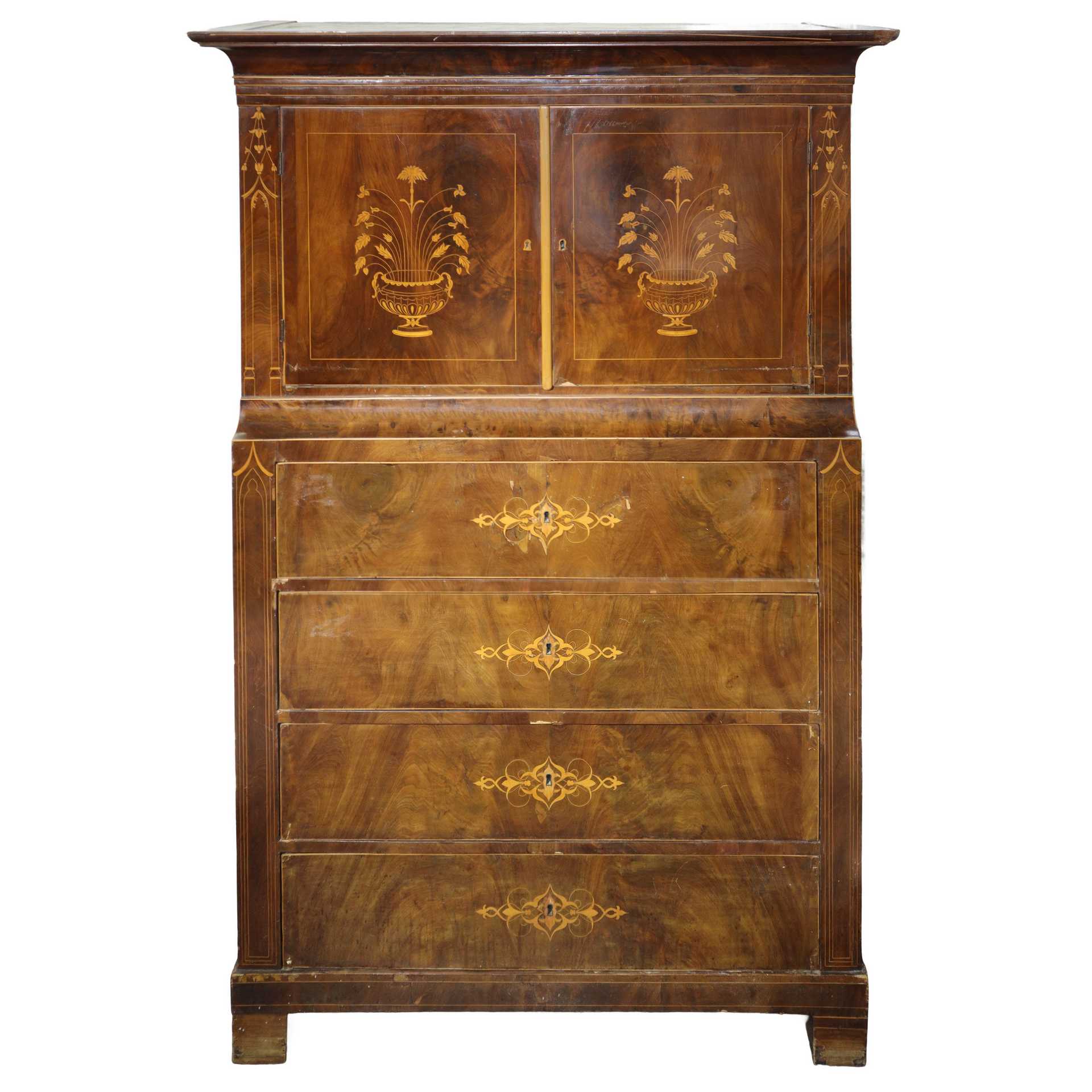 Chiffonier in legno di mogano con intarsi sul fronte e filettata ai lati, Sicily 19° secolo
