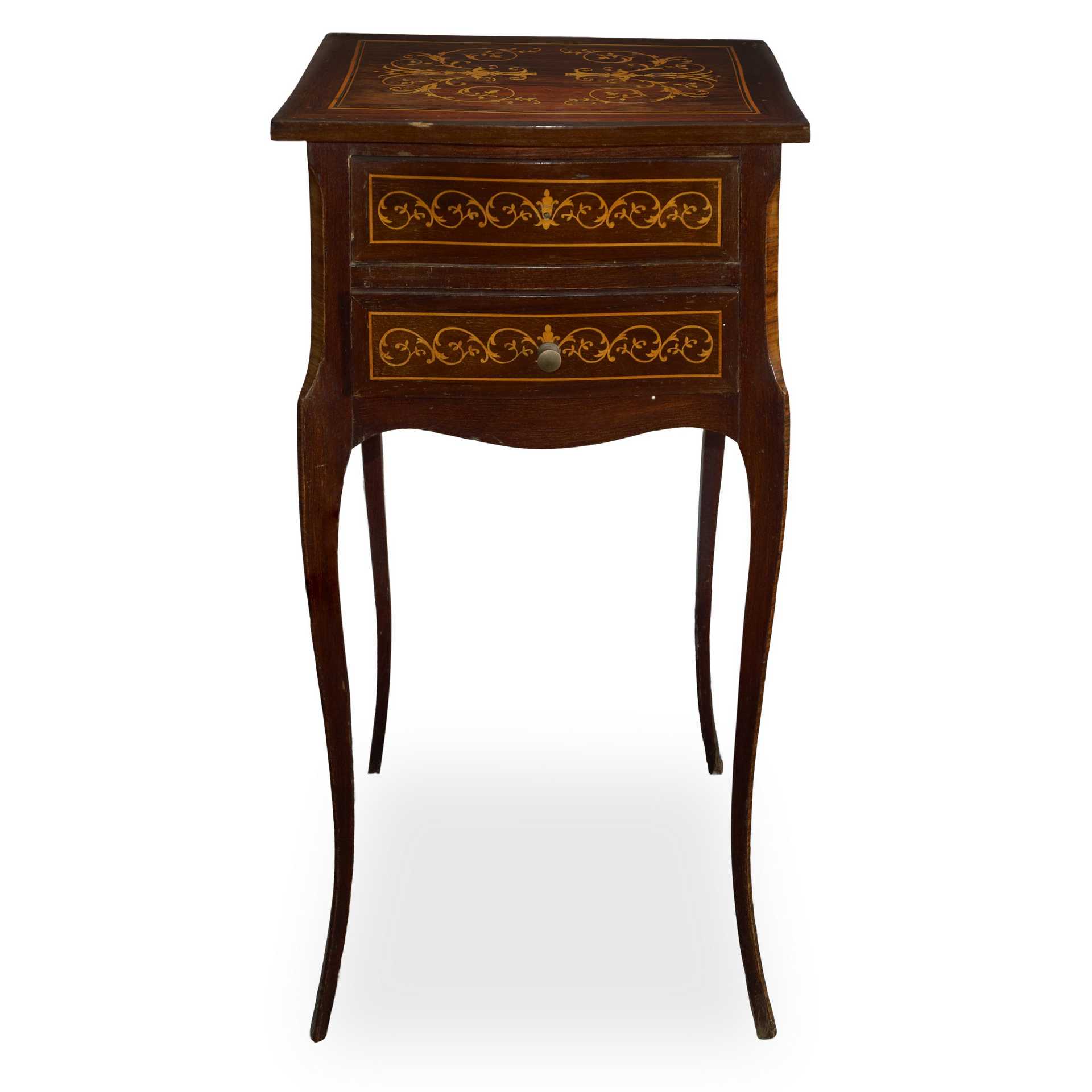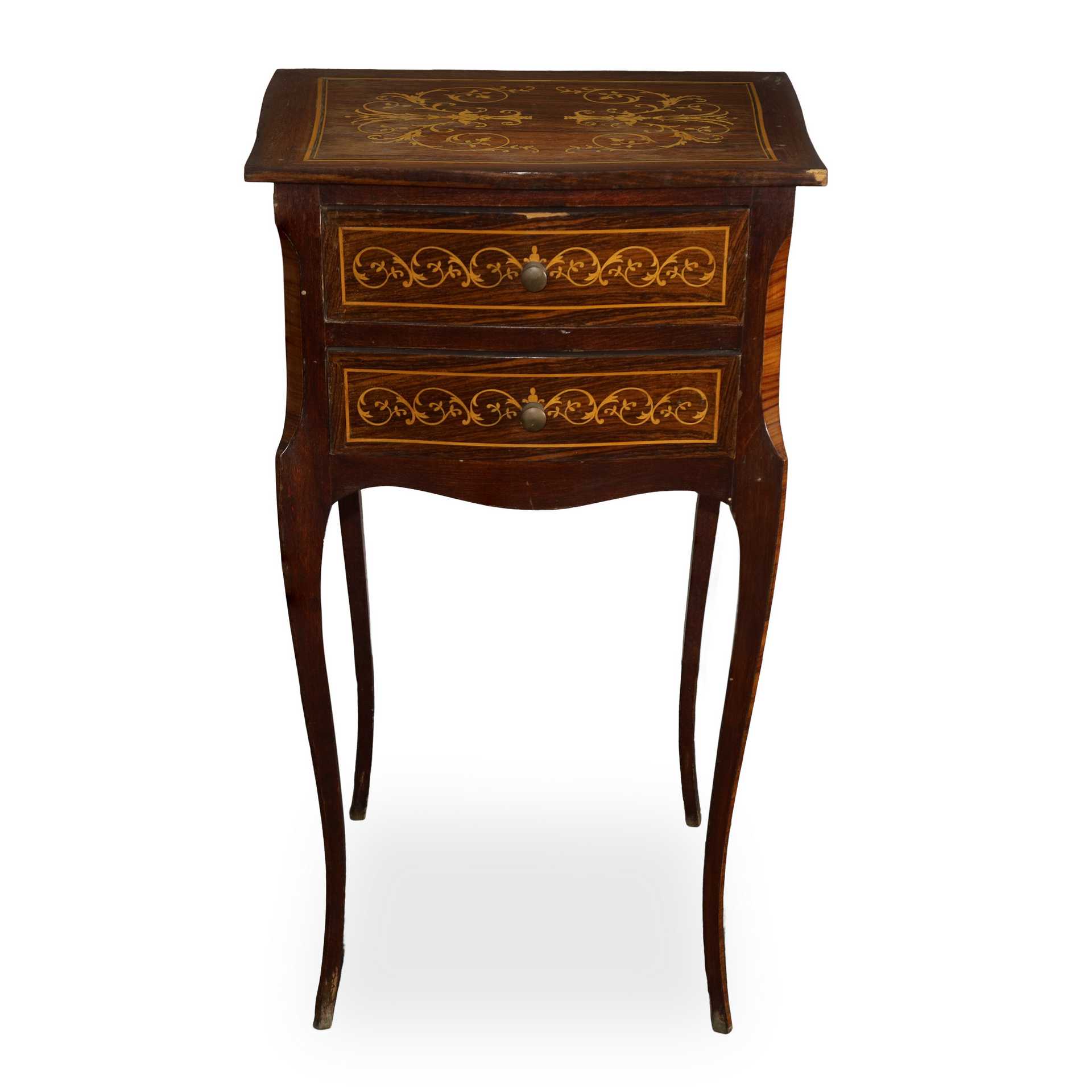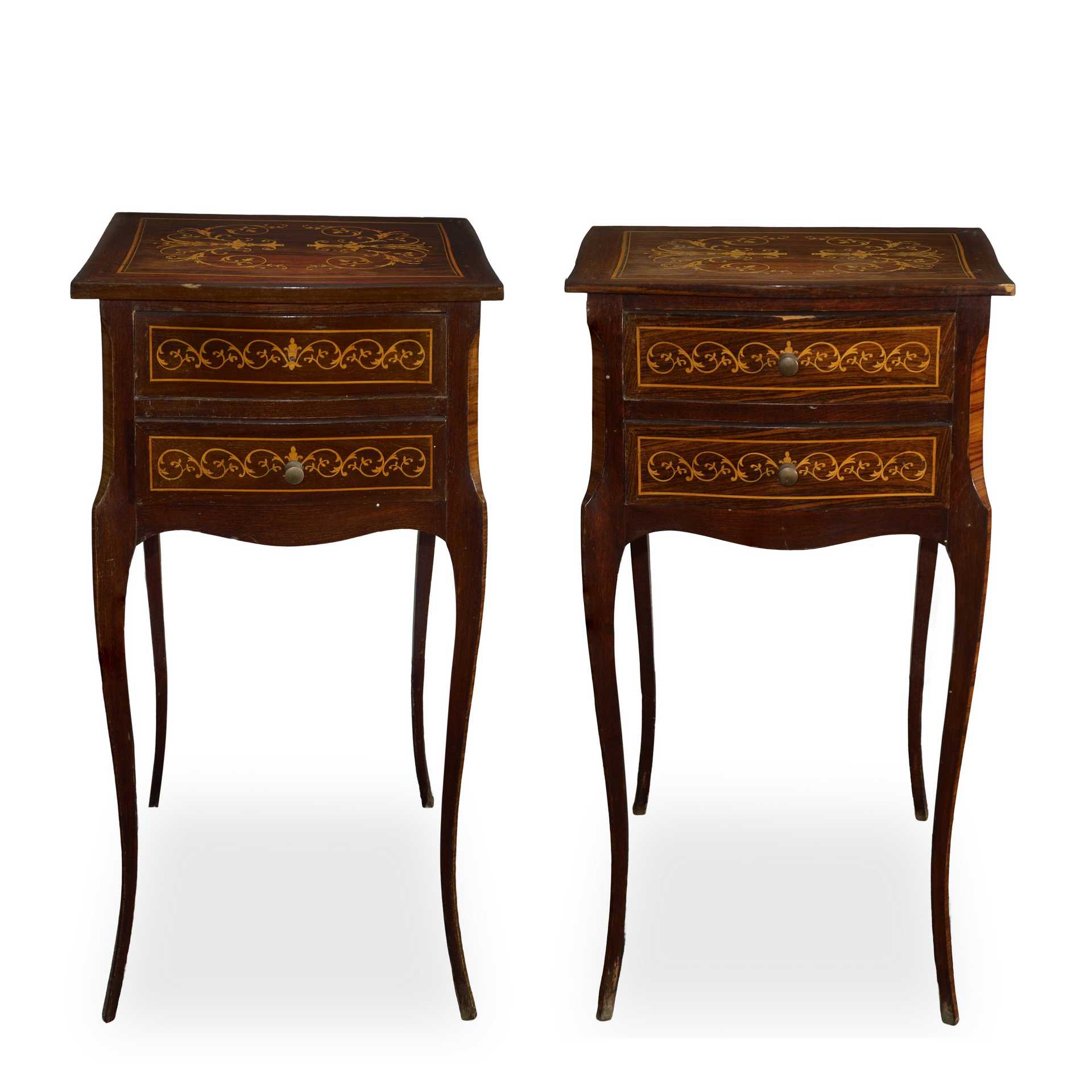 Coppia di comodini in palissandro e bosso intarsiati con due cassetti, 20° secolo