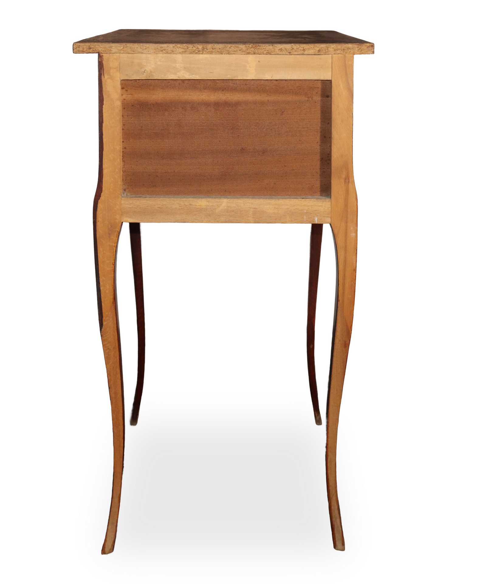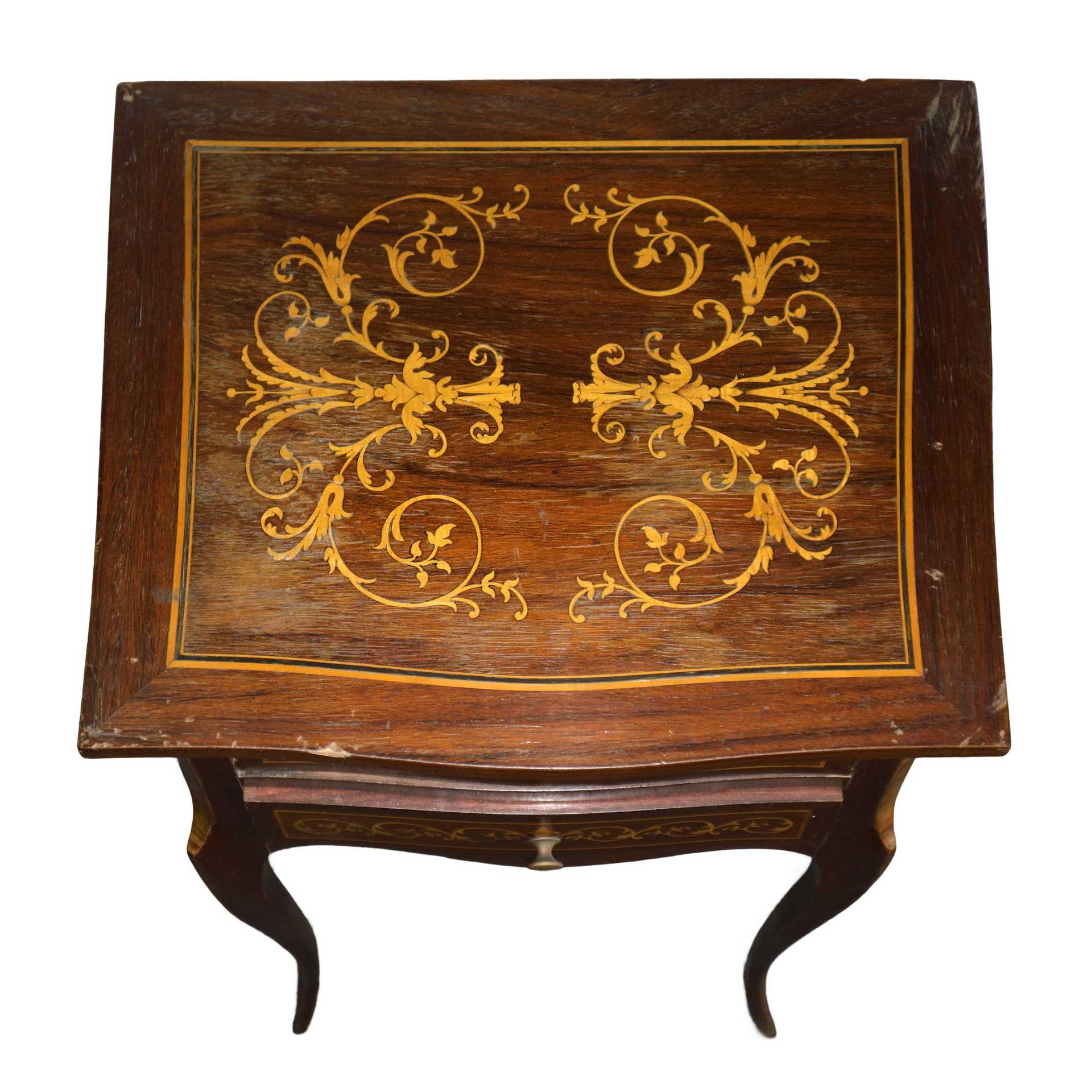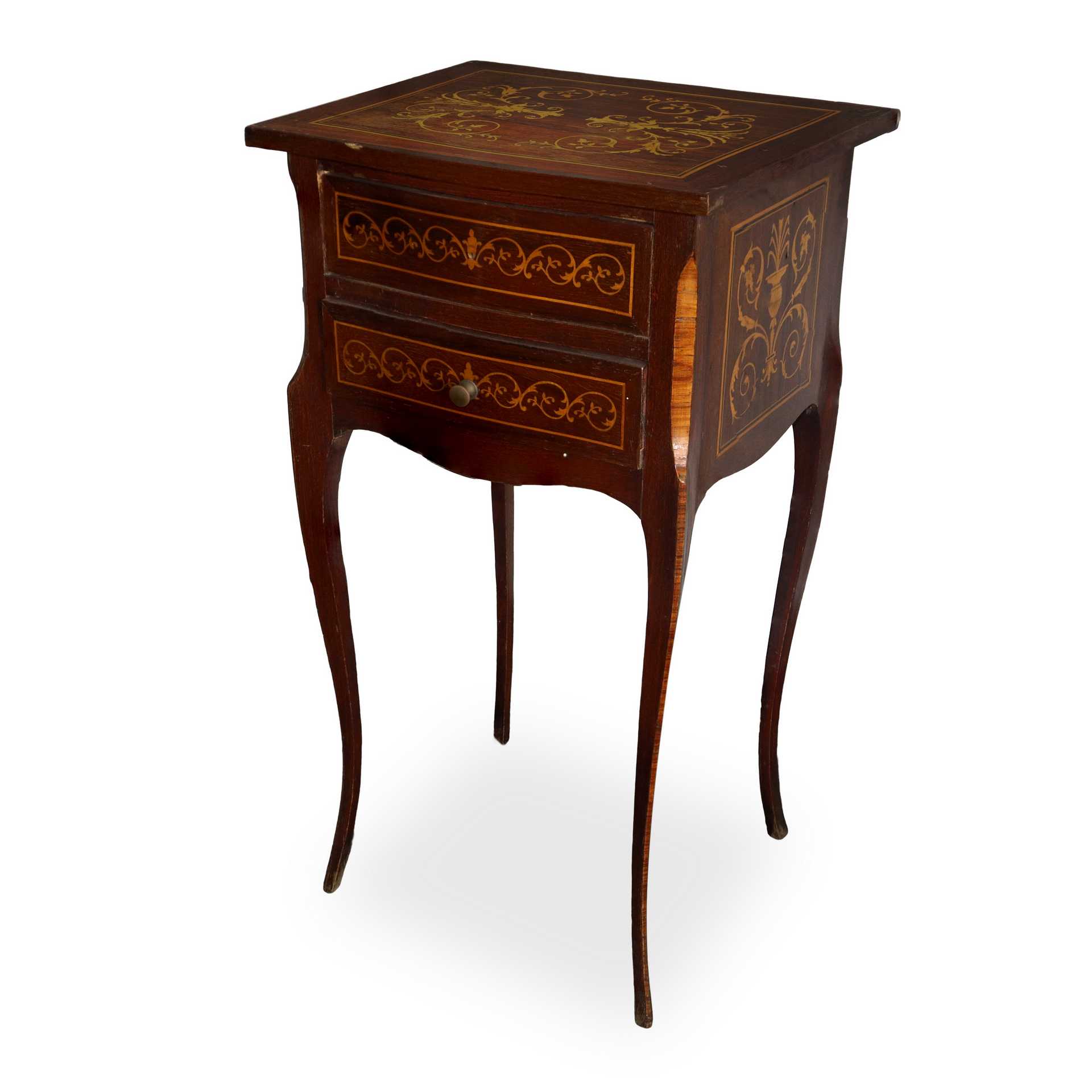 Coppia di comodini in palissandro e bosso intarsiati con due cassetti, 20° secolo